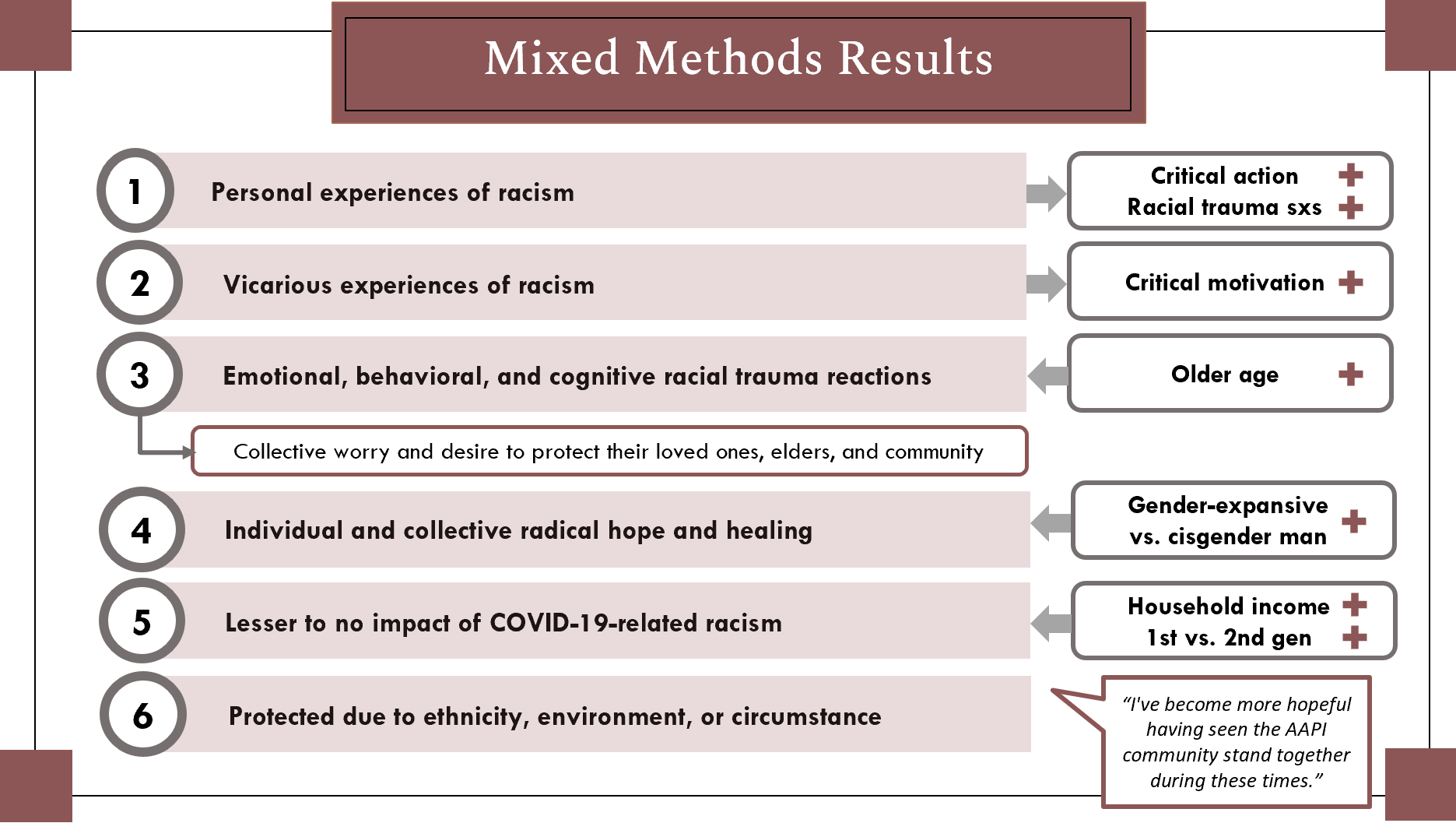 Overall, we saw that the impact of COVID-19-related racism on AANHPIs was varied, complex, and experienced on a collective level where trauma responses not only involved the self, but also individuals’ loved ones and communities. Chilling reports of traumatic experiences were also accompanied by inspiring expressions of radical hope and healing. We further found that AANHPIs in our study who described personally experiencing racism were higher on racial trauma symptoms and critical action, while those describing vicarious racism (i.e., through their loved ones, community, or the news/media) were higher on critical motivation. These findings suggest that experiences of COVID-19-related racism may have galvanized AANHPIs towards sociopolitical action to combat racism. To the extent that racial trauma was experienced collectively, individuals may have also been pulled towards collective action and community healing.